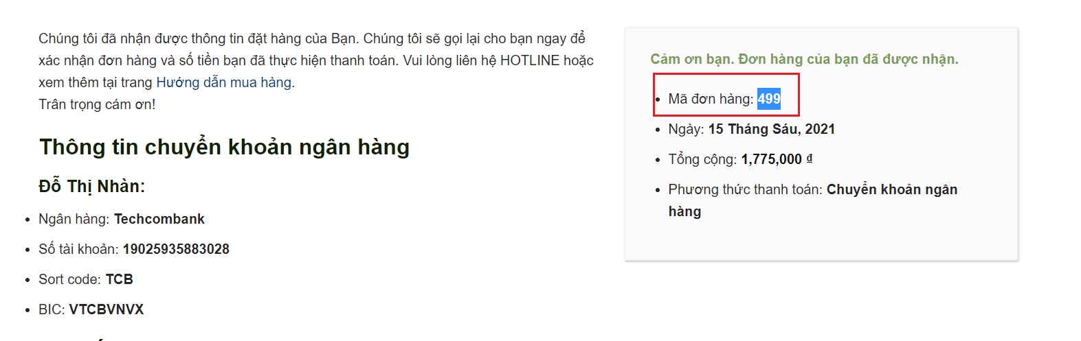 Nội dung chuyển khoản vui lòng để theo cú pháp: Số điện thoại (của bạn) _ Mã đơn hàng